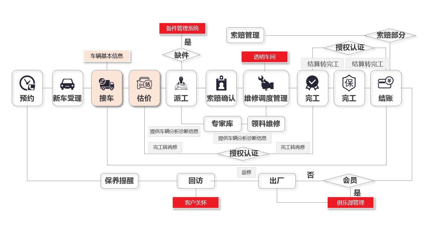 系統(tǒng)模塊是完全按照4S店售后部門及大中型修理廠來設(shè)計,每一個模塊對應(yīng)一個部門。為企業(yè)提供了汽車4S店標(biāo)準(zhǔn)的維修接待---檢測估價---派工---維修領(lǐng)料---完工---質(zhì)檢---結(jié)算---回訪的流程管理,系統(tǒng)并根據(jù)該流程自動生成公司管理層所需的各項報表,并加以人性化的輔助模塊如(保養(yǎng)估算及邀約、預(yù)約提醒、會員管理)提升維修客戶的滿意度。