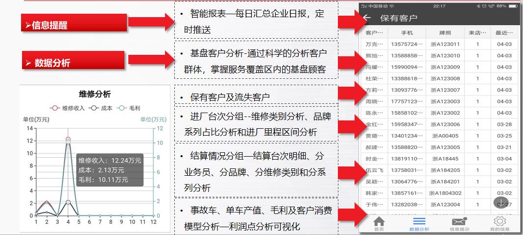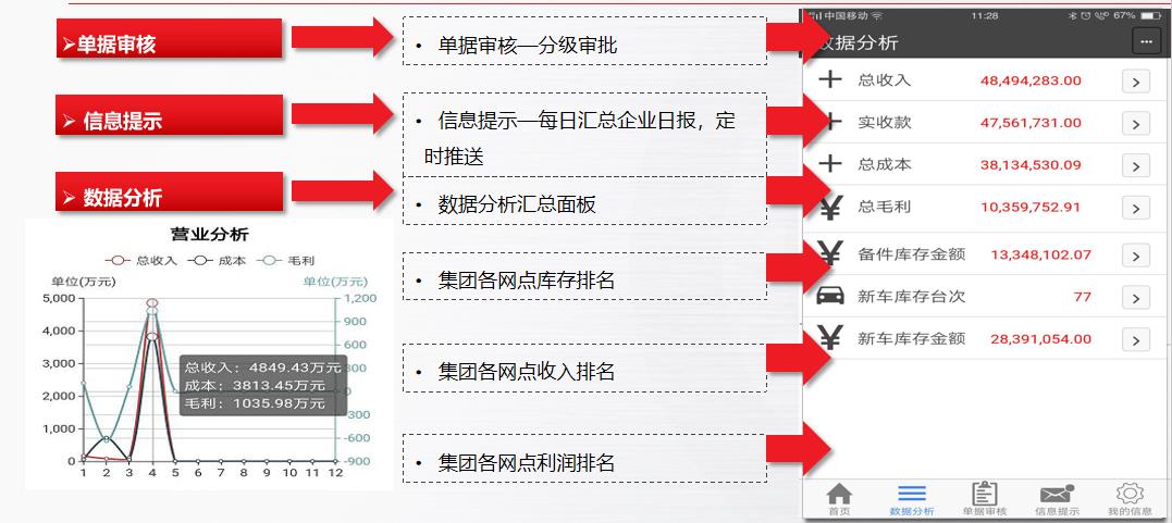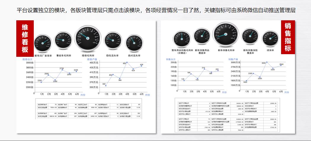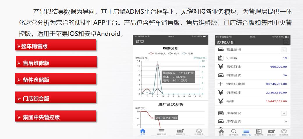 產(chǎn)品以結(jié)果數(shù)據(jù)為導(dǎo)向,基于啟擎ADMS平臺框架下,無縫對接各業(yè)務(wù)模塊,為管理層提供一體化運營分析為宗旨的便捷性APP平臺。產(chǎn)品包含整車銷售版,售后維修版、門店綜合版和集團(tuán)中央管控版,適用于蘋果IOS和安卓Android。