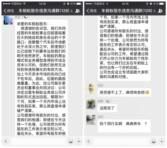 車螞蟻官方向股東發(fā)布的解散聲明稱,經(jīng)公司股東委員會和董事會共同決議:公司決定出售車螞蟻業(yè)務(wù)或公司并購的形式退出回報(bào)。期限為1個(gè)月,如果一個(gè)月內(nèi)市場上沒有找到買家,那么就直接申請破產(chǎn)清算。