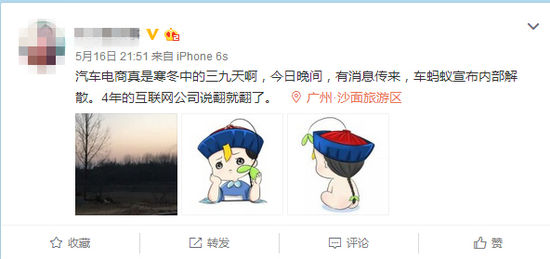 【億邦動力網(wǎng)訊】5月17日消息,昨日晚間有業(yè)內(nèi)知名記者在微博上稱汽車后服務(wù)電商公司車螞蟻正式宣布解散。今日,有媒體透露,車螞蟻財(cái)務(wù)總監(jiān)肖丹娜(花名:豆豆)昨晚在正式發(fā)布解散公告,證實(shí)了消息的真實(shí)性。